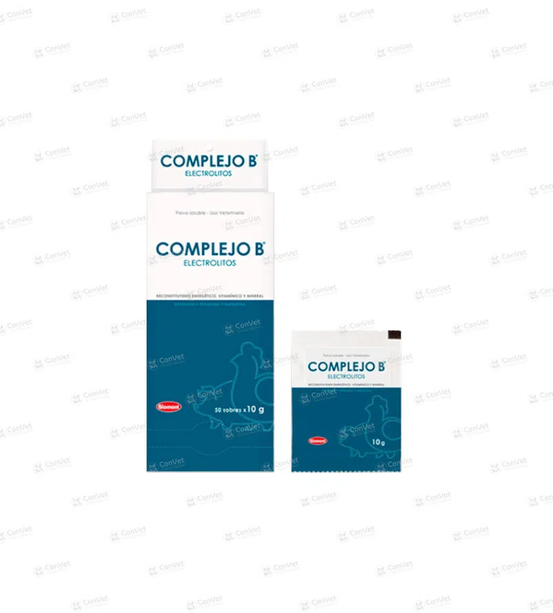 COMPLEJO B ELECTROLITOS es es un suplemento nutricional formulado a base de electrolitos, vitaminas y metionina que intervienen en las reacciones metabólicas indispensables para el correcto funcionamiento fisiológico de los animales. Está indicado como: Coadyuvante en situaciones de deshidratación e hipovolemia, provocados por diarreas, desparasitaciones, despiques, vacunaciones. Soporte en condiciones de estrés (exceso de calor, humedad, manejo, vacunación, despique, transporte, cambio de alimento, alojamiento).Coadyuvante en el tratamiento o convalecencia de enfermedades infecciosas, parasitarias, intoxicaciones alimenticias, intoxicaciones medicamentosas y estados de debilidad general.Coadyuvante en casos de retardo en el crecimiento, pobre conversión alimenticia, emplume deficiente, pododermatitis, baja postura y pobre incubabilidad.Suplemento de la ración diaria en animales con requerimientos metabólicos exigentes (crecimiento y producción).Reconstituyente en casos de deficiencia nutricional.
