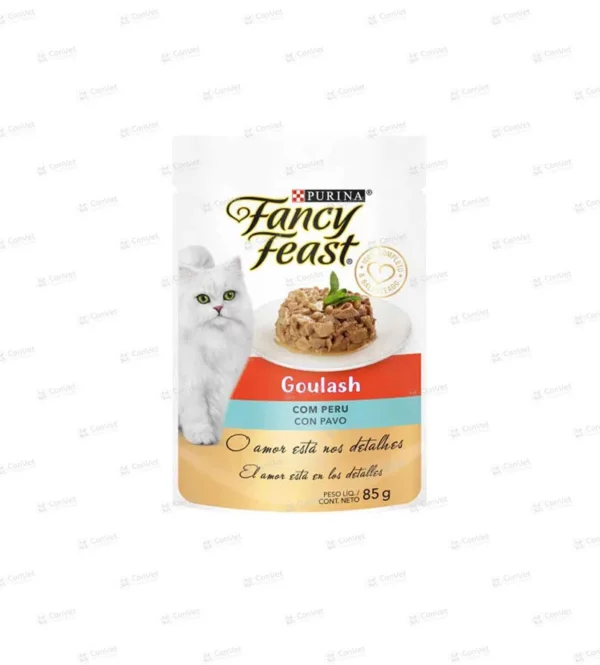 Comida húmeda súper premium para gatos adultos. Alimento completo y equilibrado. Elaborado con Goulash de muchos trozos de pavo con un toque de salsa jugosa y ligera.