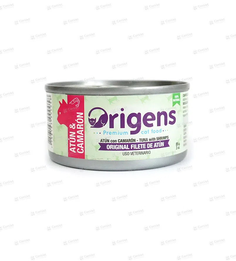 El alimento para gatos origens filete de atún con camarón está recomendado para brindar una alimentación completa.